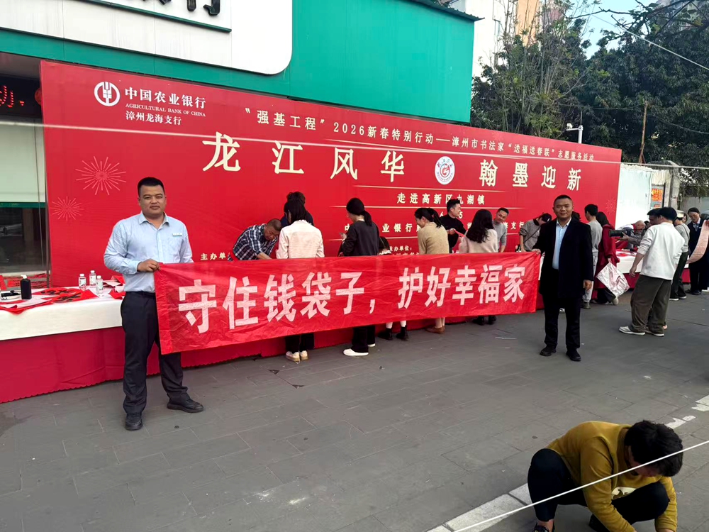 水仙飘香的漳州高新区,正奔赴一场金融与墨香的邀约。漳州龙海支行携手漳州市书法家协会、高新区九湖镇人民政府,共同举办“龙江风华 翰墨迎新”送福送春联暨金融知识宣传活动。活动现场红纸铺展、墨香四溢,市书法家协会的老师们欣然提笔、挥毫泼墨,创作出一副副寓意吉祥的春联和“福”字,还以创意活化金融知识,把专业知识与传统对联形式相结合,让金融知识自然融入日常生活,过往群众爱不释手,纷纷争相领取。现场的支行宣传员结合当地消费需求向群众重点讲解个人信息保护要点,提醒消费者警惕贷款诈骗,树立理性消费观念。