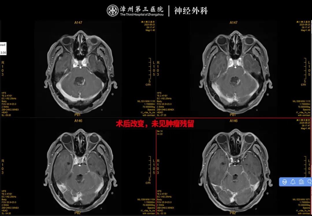 手术当天,在林友城副院长的带领下,手术团队凭借丰富的临床经验和精湛的技术,有条不紊地操作。他们小心翼翼地分离病变与周围神经血管的粘连,精准避开脑干及重要功能区,逐步将占位病变完整切除。整个手术过程紧张而有序,最终顺利完成,术中出血量少,未对周围正常组织造成损伤。