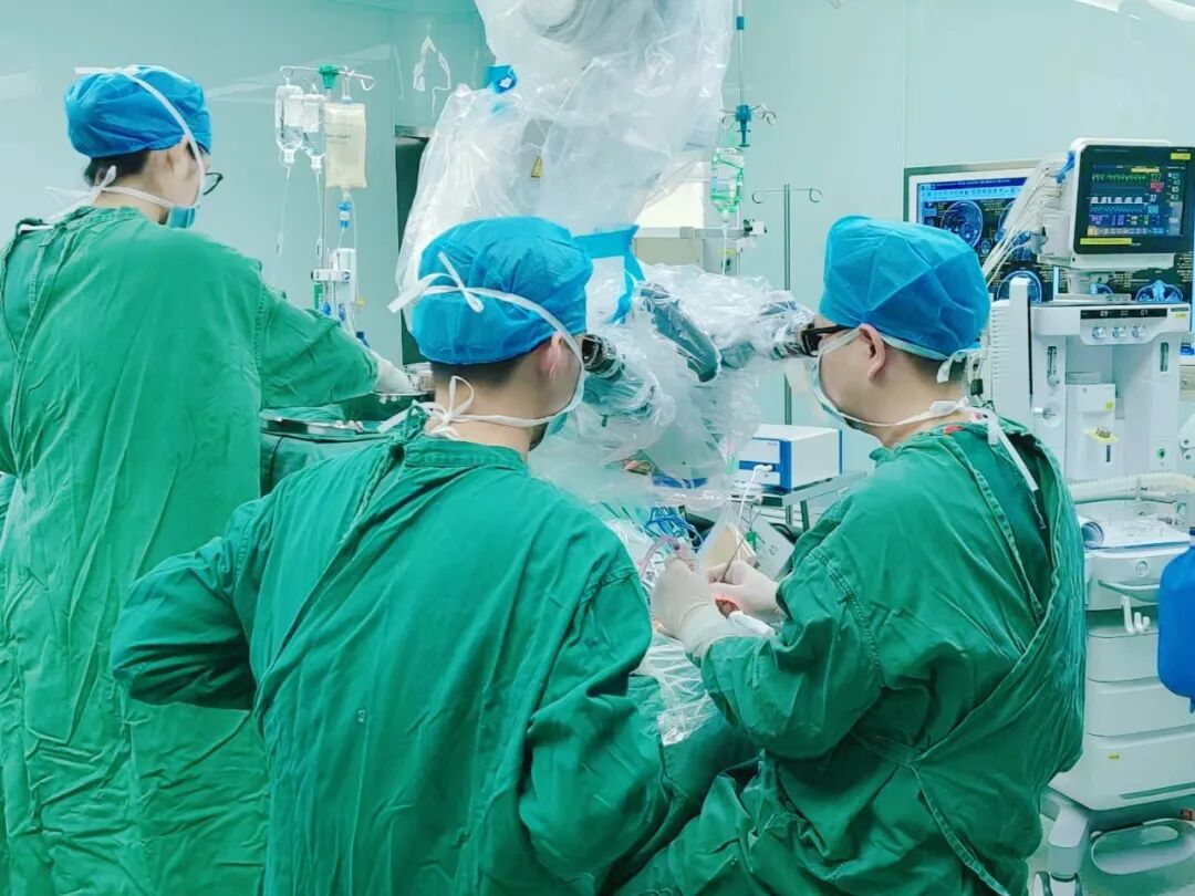 神经外科团队第一时间紧急会诊,深知这颗“复杂炸弹”的凶险:位置深、形态不规则,宽颈分叶的结构,且与周围的血管关系密切,让手术夹闭难度陡增,加上深夜突发,必须与时间赛跑,神经外科团队经过详细的术前讨论,迅速敲定“纵裂入路分区并列组合夹闭动脉瘤”。主刀医生神经外科卢炜鹏主任凭借多年深耕脑血管病领域的经验,在显微镜下精准操作,逐一分开动脉瘤周围复杂结构,将分叶的瘤体分区夹闭,同步引流颅内积血、置入颅内压监测装置。整个手术紧张有序,最终成功“拆弹”,未伤及周围正常组织。