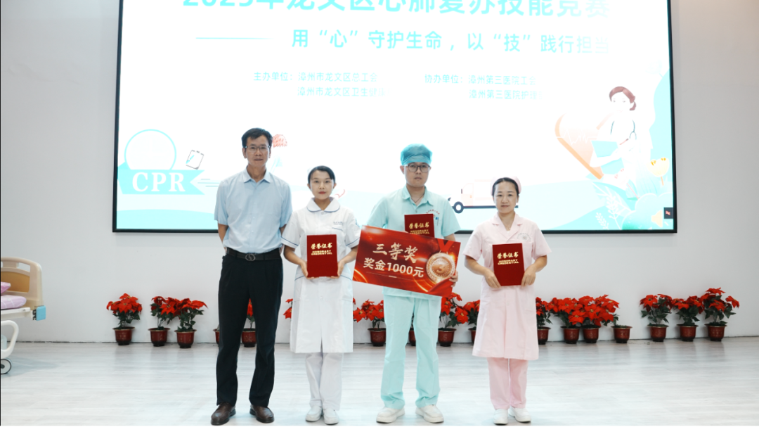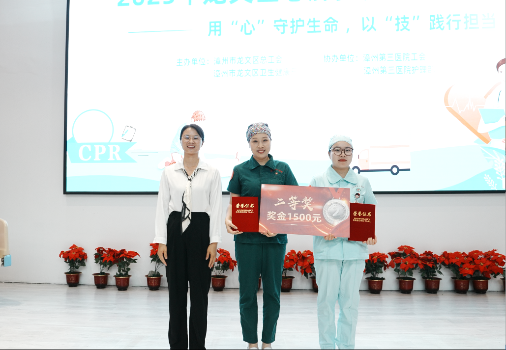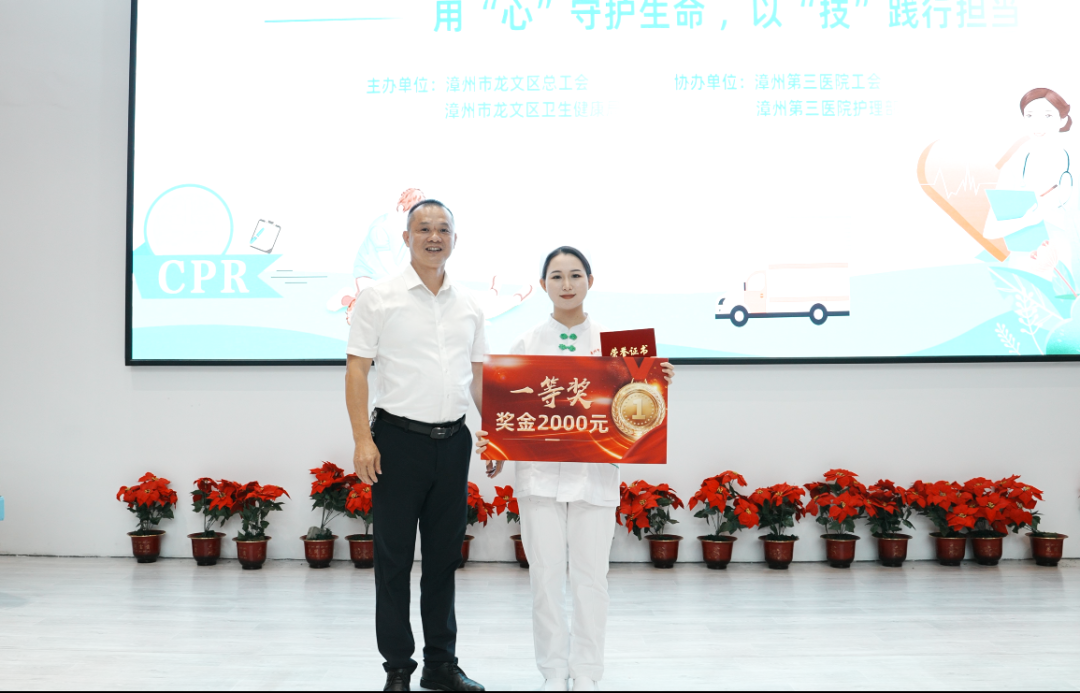 在随后举行的颁奖仪式上,龙文区总工会党组成员、二级主任科员郑艺伟为一等奖获得者颁发了奖项;龙文区卫生健康局应急中心主任郑秀慧为二等奖获得者颁奖;漳州第三医院副院长卓秋贵为三等奖获奖者颁发荣誉;漳州第三医院工会主席赵鹏、院长助理康亚婵、护理部主任田原卿共同为优秀奖获得者颁奖。