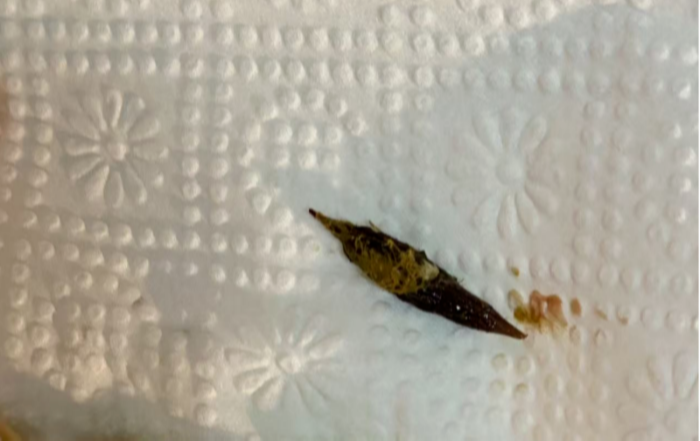 方松山主任经过检查,在患者的直肠末端发现了一枚尖锐的枣核——它已经卡在肛门。