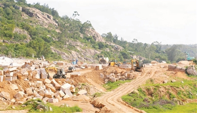 近日,在龙海市隆教乡,沿海大通道贵州段与漳龙段交接处,挖掘机、铲车等各类机械相互配合,加快转移切割好的巨石(如上图)。
