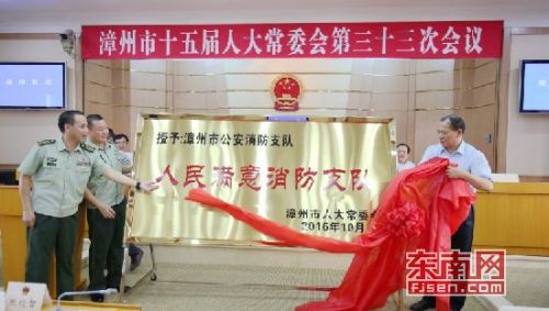 10月26日,漳州市人大常委会召开第十五届人大常委会第33次会议,审议《漳州市人大常委会关于评议市公安消防支队争创“人民满意消防支队”的意见报告》,会议通过授予漳州市公安消防支队2015-2016年“人民满意消防支队”荣誉称号。漳州市人大常委会主任陈汉夫亲自向消防支队军政主官隆重授牌。