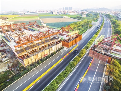 这是记者12日航拍的厦漳同城大道Ⅱ-1标段。目前该段完成工程进度68%,正加紧进行结构物施工。厦漳同城大道作为厦漳同城化的“开篇之作”,是一条集旅游、休闲、集疏、景观于一体的现代化城市快速路。建成后,漳厦两地将形成半小时生活圈。 (记者 游斐渊 摄)
