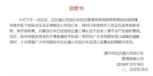 今天早上,海都记者从达达通公司得到证实,昨天确实多个站点出现黄大姐反映的类似情况,他们昨天在公众号上为此发布了致歉信,并安排技术人员连夜抢修系统。截止12月20日00:46,达达通公共自行车系统已全部恢复,市民可正常使用。12月19日当天有将公共自行车放入自行车锁止器蹲位的不会产生超时扣费,请市民放心。