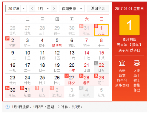 放假时间:2016年12月31日至2017年1月2日(周六至周一),共3天,因为元旦时周日,1月2日补休,1月3日正式上班。