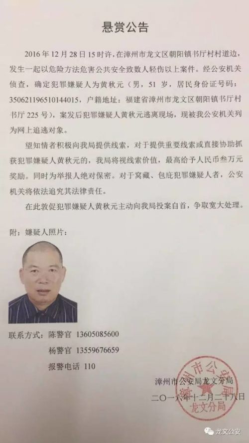 2016年12月28日15时许,在漳州市龙文区朝阳镇书厅村村道边,发生一起以危险方法危害公共安全致数人轻伤以上案件。经公安机关侦查,确定犯罪嫌疑人为黄秋元(男,51岁,居民身份证号码:350621196510144015,户籍地址:福建省漳州市龙文区朝阳镇书厅村书厅225号),案发后犯罪嫌疑人黄秋元逃离现场,现被我公安机关列为网上追逃对象。