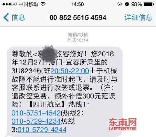 航班起飞前 短信通知飞机有故障