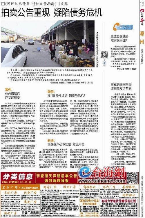 据悉,海峡物流城的各类债权人可在1月16日至2月14日工作日时间,持相关资料向福建联合信实律师事务所(地址:厦门市思明区湖滨南路334号二轻大厦9楼)进行申报登记与物流城形成的真实、合法、有效且未超过诉讼时效期限的所有债权。 (见习记者 叶蔚蓉 记者 林晓琪)