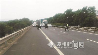 1月16日10时许,漳州高速交警三大队民警接到群众报警,“沈海高速B道2433公里(云霄县东厦镇往漳浦县方向)有两头牛在高速公路上来回穿插狂奔,情况非常紧急。