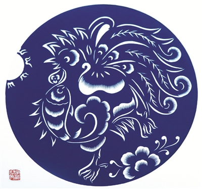 这组剪纸作品出自漳州市非物质文化遗产剪纸代表性传承人陈燕榕之手。陈燕榕介绍,这组贺岁主题的剪纸一共四张,在纸张颜色选择上与以往有所不同,一改红色为主的传统,取色多样,以套色的形式加以点缀,没想到却起到了画龙点睛的效果,使之更加生动形象;在形状上则以圆形为主,采用“阴剪”手法,先将各种雄鸡姿态活灵活现地勾勒出来,经过半个月精剪细裁,呈现鸡年生机勃勃的景象。
