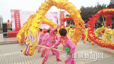 今年元宵节期间,市区人民广场举行了一场社区文化活动。随着“咚咚咚……”一阵铿锵有力的锣鼓声响起,两条11米长的金色巨龙,在28名队员手中上下翻飞,并跟着绣球做各种动作,忽左忽右,忽高忽低,忽摇头忽摆尾,动作轻盈,让人看了眼花缭乱,不禁为玄壇宫女子舞龙队行云流水的表演喝彩。