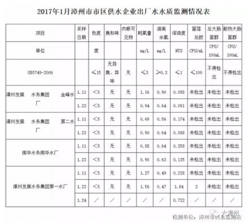 “2017年1月漳州市市区供水企业出厂水水质监测情况”。