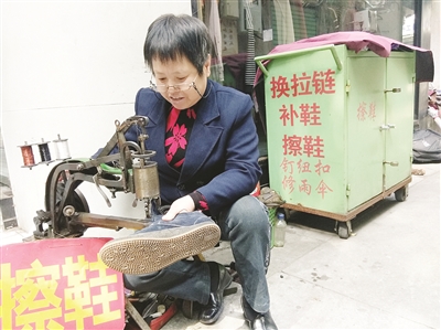 ◀朱荣花11年如一日坚守修鞋摊