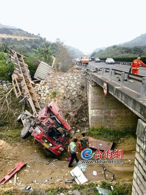 4月15日上午9:10,一部运载搅拌混凝剂的集装箱货车途经高速公路沈海线龙海白水路段时,发生交通事故,翻落到5米深的高速公路桥底,车内一名驾驶员受困,车辆箱体严重变形肢解。