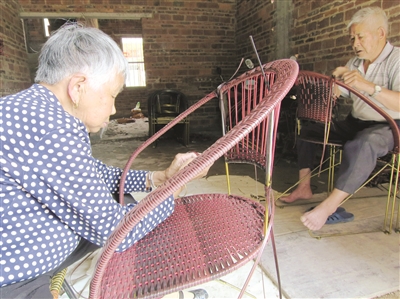 龙海市程溪镇叶仑村82岁的陈荣发和77岁的老伴欧阳美莲,在家里帮一私营企业加工藤椅。陈荣发说,他们在家帮人加工藤椅已经好几年了,每天可加工藤椅八只,每只加工费八元,每天赚六十多元。老人说,和儿子分家23年来,尽管孩子们都很乖,但他们觉得身子硬朗,劳动惯了,喜欢靠自己双手赚钱度日,这样也活动筋骨、有益身心。