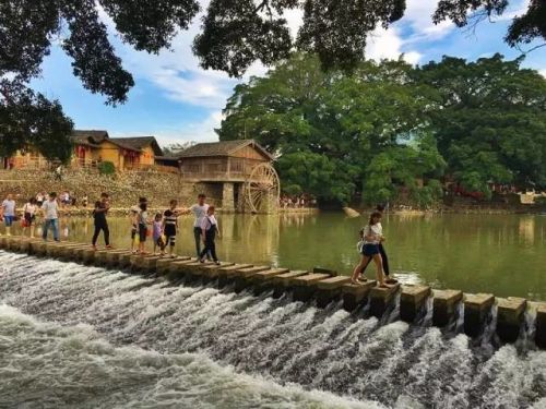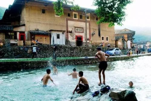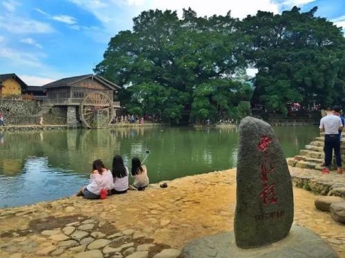 你看,几座青砖老屋傍溪而立,屋后几级石阶,石阶上是一个土坪,住着几户人家,一个老者倚坐在一棵千年的古榕下,还有那一部古老的水车,一条卵石小径,一个个横卧溪间的水步石,此景却是别样的自然风致,亦是一幅素朴的水墨画。