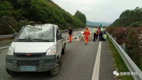 在事故现场,只见一辆广东籍的微型货车停在超车道上,挡风玻璃被氧气罐砸的随裂,面对满路面的鱼,驾驶员余师傅和同车的伙计一脸的焦虑在现场束手无策。经了解,他们是从漳州要载活鱼回广东澄海,正在路上行驶,不料突然车辆爆胎,采取措施不及,结果发生交通事故。“还好,氧气瓶没有砸到我们自己——”,驾驶员在诉说过程中唏嘘不已。