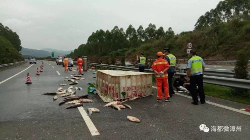 5月2日14:18,在福诏高速公路三平互通路段,一辆微型货车在主车道上行驶,突然车辆连爆两个胎,车辆失去平衡,立即撞向中央护栏,结果车没翻,车上的鱼却翻在路面上,出于惯性,氧气瓶砸向车头,一地的活鱼在路上活蹦乱跳的……