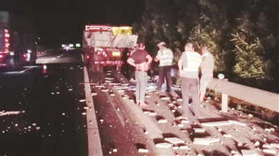 7月30日凌晨0时45分,沈海高速漳州往广东方向诏安路段,一部半挂牵引车冲撞路侧护栏,造成护栏严重损坏的同时,车载的石板材掉落路面,破碎的板材撒满路面。