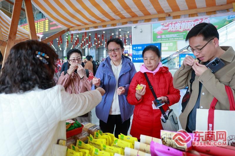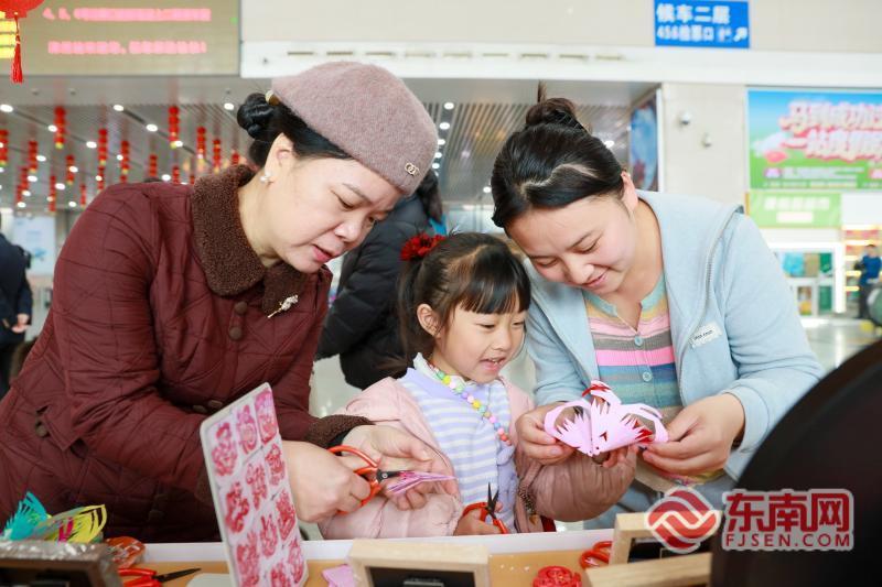 水仙花雕刻、剪纸、木版年画、猜灯谜等传统技艺展示台前,艺人现场献艺,手把手教旅客体验非遗。剪纸艺人指尖翻飞,短短几分钟,一张寓意“马年吉祥”的窗花便跃然纸上,递给身边的小朋友。“我第一次体验剪纸,跟着老师剪了一个小福字,打算带回家贴在窗户上,特别有纪念意义。”来自福建龙岩的旅客陈阿姨拿着自己的作品,笑得合不拢嘴。另一边,白水贡糖、香脯糕等闽南特色小吃现场制作,香甜的气息弥漫在候车室各个角落,旅客们争相品尝,沉浸式感受闽南年味。