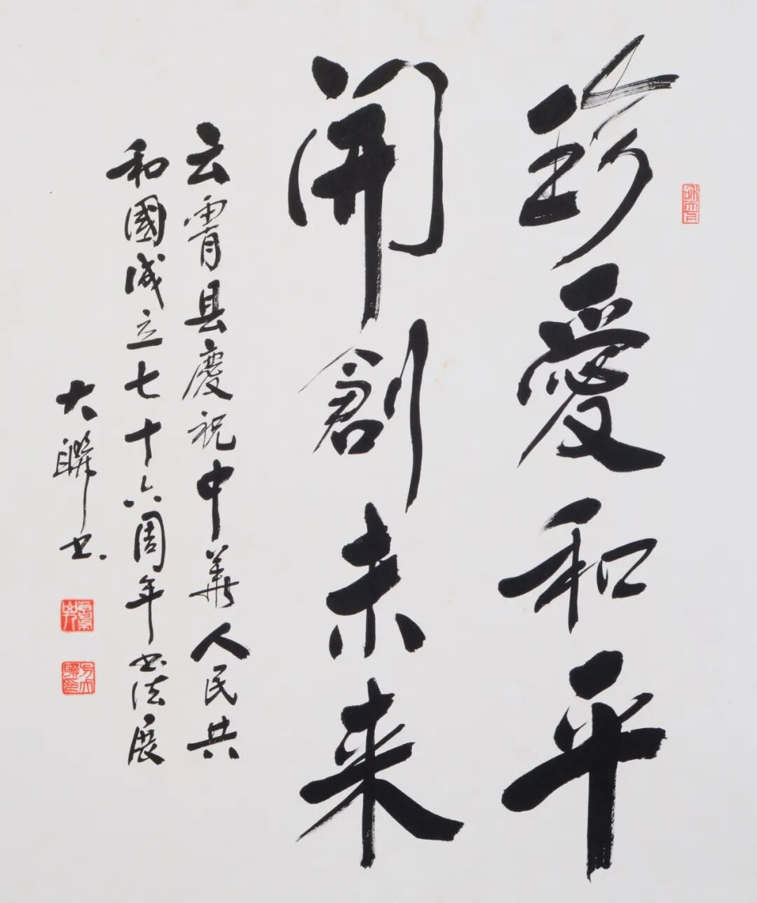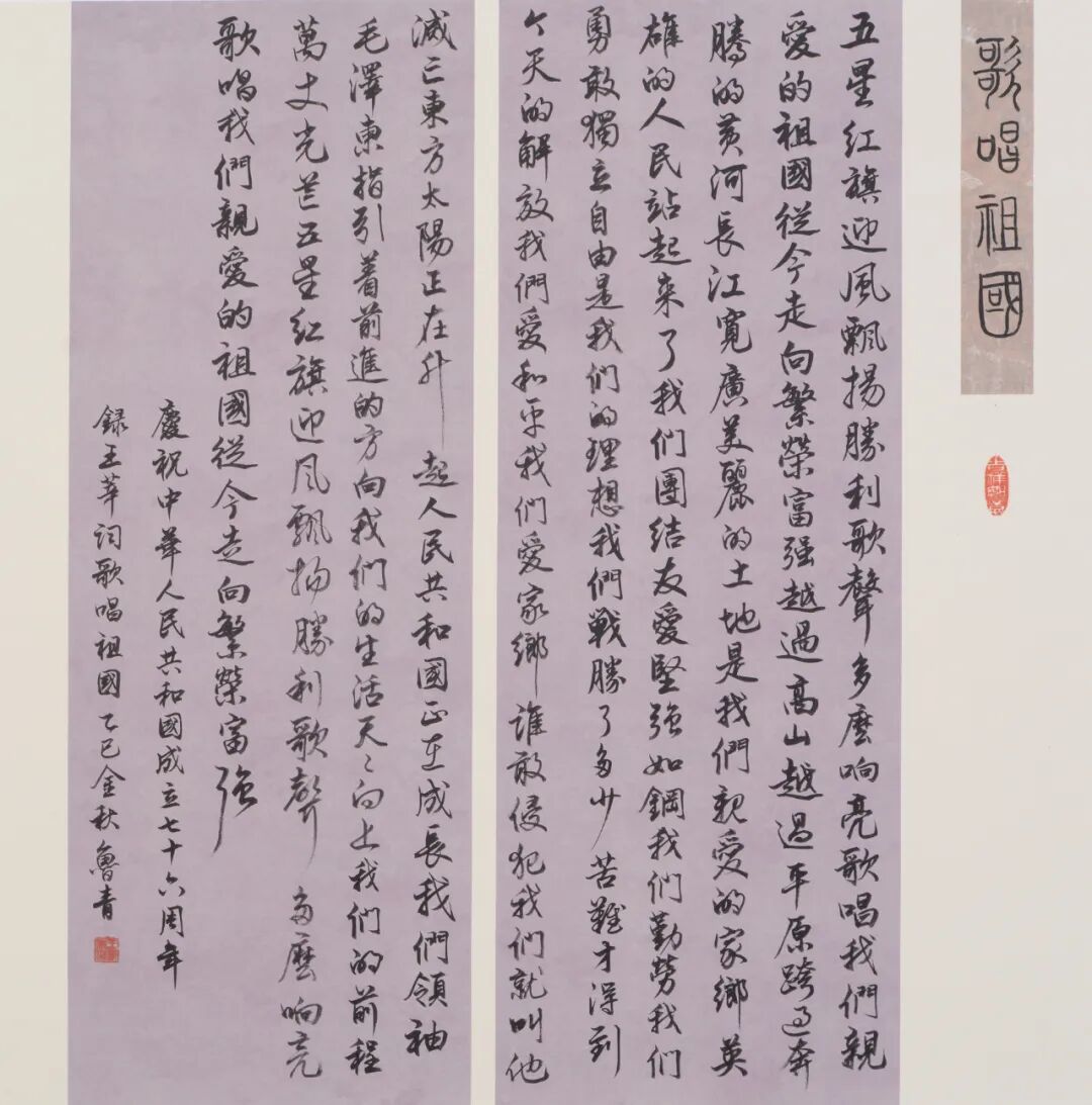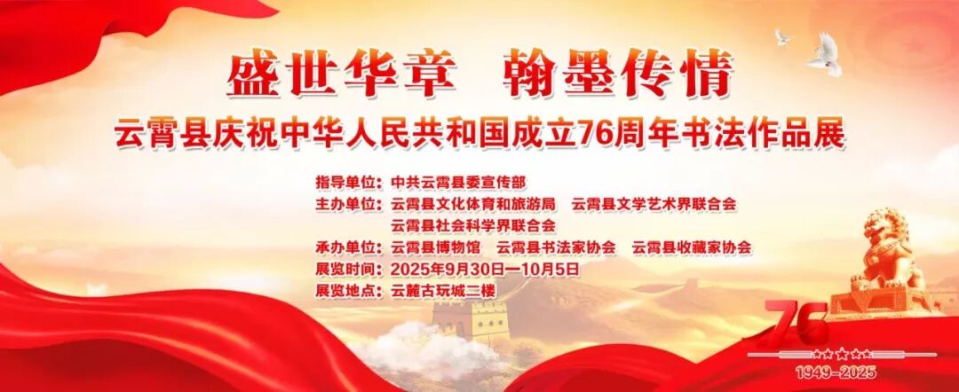 庆盛世华诞,迎中秋满月。中共云霄县委宣传部指导,云霄县文化体育和旅游局、云霄县文学艺术界联合会、云霄县社会科学界联合会举办了“盛世华章.翰墨传情”—云霄县庆祝中华人民共和国成立76周年书法作品展。这是对伟大祖国的深情礼赞,也是对新时代繁荣发展的艺术颂歌。展览共征集云霄县书协会员76幅精品力作,以“歌颂党、歌颂祖国、歌颂人民”为主题,通过篆、隶、楷、行、草等多元书体,展现时代风貌,传递创作者对时代的深刻感悟与“坚守中华文化立场,坚持以人民为中心”的初心。